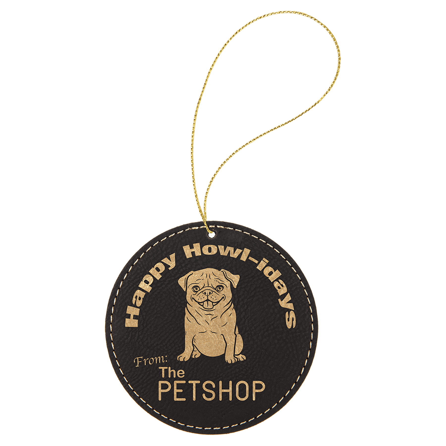 Black/Gold Laserable Leatherette Round Ornament with Gold String (Sold by Case of 25)
